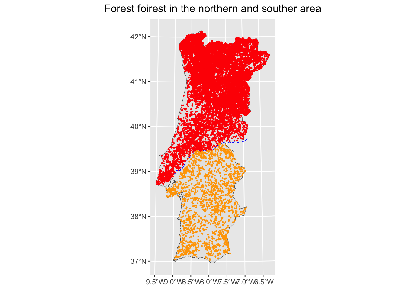 In continental Portugal, the northern half of the country (above the Tagus River) is characterized by the predominance of forest and semi-natural areas, and by the development of the main cities with their sub-urban ares intermingled with wild land, which the Northern area highly prone to forest fires. On the other hand, the southern half of the country is dominated by agricultural areas with mixed and broad-leaved forest concentrated near the south-west coast, which makes this are less affected by forest fires. For this reason we will consider these two areas separately.